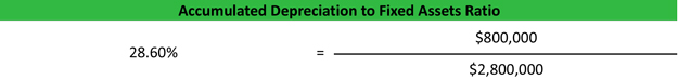 First, the land value is subtracted from the total fixed assets to reveal depreciable fixed assets of $2,800,000. Then, accumulated depreciation of $800,000 is divided by $2,800,000. The result is 28.6%, which means the company’s existing fixed assets are only worth around 70% of their original value.