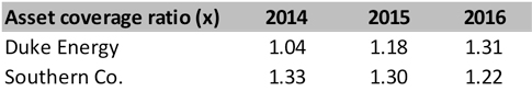 The first thing to note is that, from 2014 to 2016, the asset coverage ratio has been above 1 for both the companies. This shows that the debt obligations are much less than the total amount of company assets and are well covered. In other words, the company would be able to pay off all of its debts without selling all of its assets. However, one key difference is that for Duke Energy the coverage ratio has been improving while for Southern Co it has been deteriorating.
