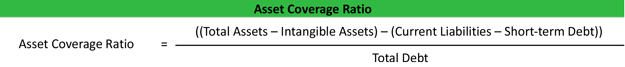 Asset coverage ratio formula is calculated by subtracting the current liabilities less the short-term portion of long term debt from the totals assets less intangibles and dividing the difference by the total debt.