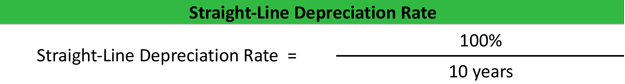 Assume a company purchases a piece of equipment with a 10-year useful life and a salvage value of $1,000 for $20,000. This is a ten-year asset, so the straight-line rate is calculated by dividing 100% by 10.