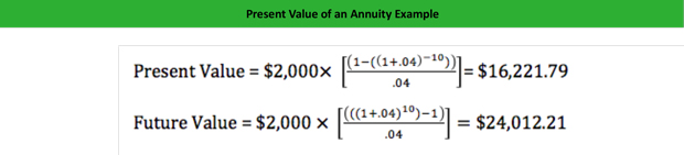 Let’s keep things simple and assume you receive an annuity payment of $2,000 each year for 10 years. As you receive the annuity payments at the end of each year, you decide to save and invest the cash into a safe investment earning 4%. To better understand the true cash value of this annuity, let’s determine the present and future value: